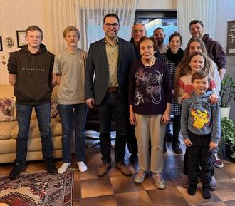 Foto: VG; Frau Pfeffer zusammen mit Herrn Bürgermeister Weber im großen Kreis ihrer Familie