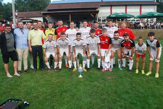 Zum dritten Male Hackmesser-Pokalsieger in Folge wurde Landesligist SG Eppenbrunn. Unser Bild zeigt die Siegermannschaft stehend von links (ein Fan); den Hilster Ortsbürgermeister Philipp Andreas; ein Fan; Verbandsbürgermeister Klaus Weber; Janis Schira; Andre Dengel; Jonas Wolfer; Dennis Neb; Luca Mangold; Christofer Anschütz; Noel-Maurice Weis; Patrick Schmitt (Hilster SV); vorne von links Nicolas Eichhorn; Maximilian Matzohl; Tarek Rabahi; Peter Leonard Zimmermann; Jan Grünfelder; Andrei Roman und Tobias Dreyer; (zwei jugendliche Fans). Foto: Remy Süs