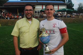Pokalübergabe von Verbandsbürgermeister Klaus Weber an SGE-Spielführer Dennis Neb. Foto: Remy Süs