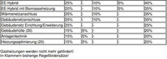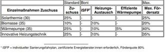 So wurde beispielsweise die Regelförderung für energetische Einzelmaßnahmen bei Bestandsgebäuden um 5 Prozent, von bisher 20 auf jetzt 15, gekürzt. Die Regelförderung für neue Heizungen wurde um 10 Prozent, beispielsweise für Wärmepumpen von 35 auf 25 Prozent, und bei Biomasseheizungen (Pellet, Scheitholzvergaser) sogar um 25 Prozent auf jetzt nur noch 10 Prozent Regelförderung gekürzt.