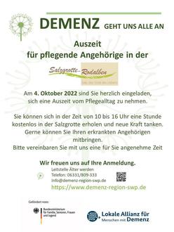 Pflegenden Angehörigen bleibt meistens kaum noch Zeit, um eigenen Bedürfnissen nachzugehen. Mit einem Besuch in der Salzgrotte Rodalben möchte die Lokale Allianz für Menschen mit Demenz im Landkreis Südwestpfalz die Leistungen der pflegenden Angehörigen anerkennen und ihnen die Möglichkeit geben, neue Kräfte zu tanken.