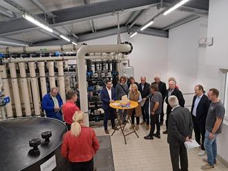 Foto: B. Danner; Den Reden bei der Einweihungsfeier durfte der obligatorische Rundgang nicht fehlen. Die Aufnahme zeigt Wassermeister Peter Haag am runden Tisch stehend bei seinen Erläuterungen. Ganz rechts dessen designierter Nachfolger Wassermeister Sebastian Mostberger.