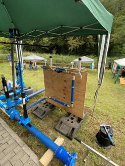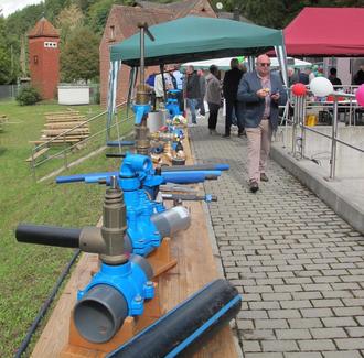 Während Bürgermeister Weber noch beim offiziellen Rundgang durch das neue Wasserwerk mit Wassermeister Peter Haag war, sich andere der Geladenen stärkten, kamen die ersten Besucher zum rund vierstündigen Tag der Offenen Tür mittels Shuttle-Service ab der Pirmasenser Biogasanlage. Viele ließen sich informieren, wo ihr täglich frisches Trinkwasser herkommt. Geschmacksproben durften dabei nicht fehlen. Für die kleinsten Besucher gab es ein buntes Unterhaltungsprogramm. Dazu zählten auch Wasserspiele.