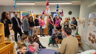 Die Teilnehmer*innen beim deutsch-französischen Treffen wurden von den Kindern in der Kita Liederschiedt begrüßt und konnten bei einem Rundgang die Vorzeige-Kita kennenlernen.