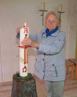Zu den Aufgaben einer Sakristanin gehört auch das Anzünden der Kerzen. Unsere Aufnahme zeigt Gerlinde Helfrich beim Anzünden der Osterkerze in der katholischen Kirche St. Michael Lemberg.