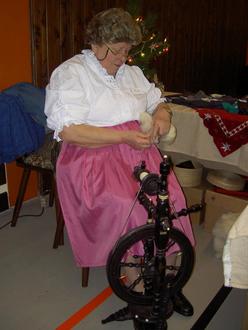 Foto: Süs; Alma Groß mit ihrem mittelalterlichen Spinnrad bei einer der vielen von ihr organisierten Veranstaltungen.