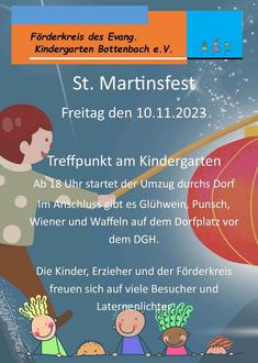 Zu unserem diesjährigen St. Martinsfest am Freitag, den 10.11.2023 laden wir alle Kinder mit ihren Familien und Freunden recht herzlich ein. Der Martinsumzug startet um 18.00 Uhr am Kindergarten, wir laufen gemeinsam zum Dorfplatz. Während des Umzugs sind mehrere Haltepunkte zum gemeinsamen Singen vorgesehen. Am Dorfplatz angekommen überraschen uns die Kinder mit einer Vorführung. Im Anschluss gibt es traditionell Glühwein, Punsch, Wiener und Waffeln.