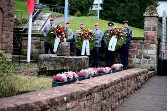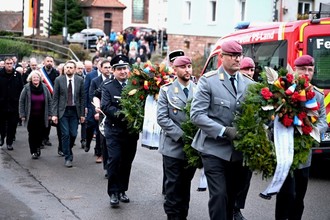 Eine Abordnung der Bundeswehr und Einsatzkräfte aus Frankreich legten gemeinsam am Ehrenmal Kränze zum Gedenken an die vielen Tote der beiden Weltkriege nieder. Musikalisch wurde die Veranstaltung vom Männerchor Vinningen und dem Musikverein Trulben umrahmt. Den kirchlichen Segen gaben Pfarrer Schröder und Pastoralreferent Adelmann. Schüler der Vinninger Konrad Adenauer Schule hielten in deutscher und französischer Sprache ein Plädoyer für ein geeintes Europa und Frieden auf der Welt.
