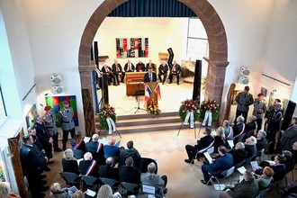 Dass die Resonanz zu diesem Gedenken am Volkstrauertag, 16. November, derart groß sein würde, damit hat niemand gerechnet. Die Alte Kirche in Vinningen platze aus allen Nähten. Es waren zahlreiche Bürgermeister der Verbandsgemeinde Pirmasens-Land, ebenso wie ihre Amtskolleginnen und -kollegen aus dem Bitscher Land bei der Kranzniederlegung anwesend. Äußerlich zu erkennen sind die französischen Bürgermeister am Tragen der „Echarpe de Maire“, wie die Scherpen mit den französischen Flaggenfarben Blau, Weiß Rot, heißen.