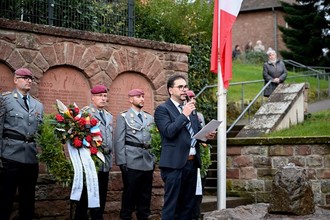 Deutsche und Franzosen legen gemeinsam am Vinninger Ehrenmal einen Krank nieder