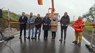 Foto: B. Danner; Offizieller Bandschnitt zur sanierten K 4. Im Bild vlnr: Bürgermeister Klaus Weber, die Ortsbürgermeister Harald Hatzfeld (Trulben) und Steffen Schwarz (Kröppen), Staatssekretärin Petra Dick-Walther, Landrätin Dr. Susanne Ganster sowie LBM-Chef Volker Priebe