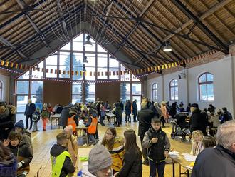 Feierstunde in der Markthalle von Bitsch. - Im Vordergrund Workshops der französischen und deutschen SchülerInnen.