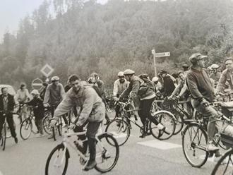 Zur Einweihung des neuen Radwegenetzes ging es von der Langmühle in den Eppenbrunner Freizeitpark. Angeführt wird die Truppe im Vordergrund vom damaligen Bürgermeister Dr. Bernhard Matheis. Foto: Bernd Danner