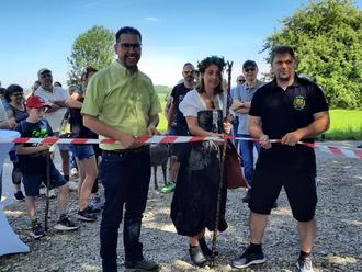 Bei der Übergabe des Schmugglerpfades am 22. Mai 2022 Bürgermeister Klaus Weber mit Schmugglerfrau Jana Richter und Kröppens Ortsbürgermeister Steffen Schwarz. Foto: Bernd Danner