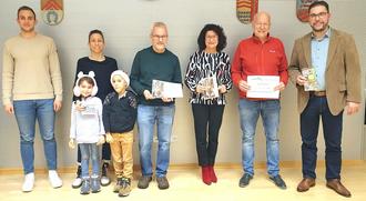 Tourismus-Sachbearbeiter David Hoffmann (links) und Bürgermeister Klaus Weber (rechts), zusammen mit vier der acht Preisträger des „Wandergewinnspiels 2023“, von links Sina Greiner mit ihren beiden Kindern, Kurt Deutschmann, Elfriede Heidingsfeld und Thomas Matheis. Foto: L. Feldner