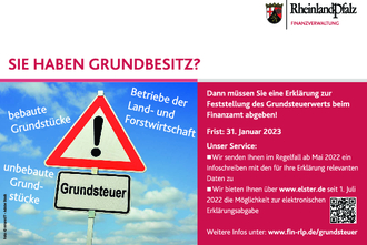 | - | umfangreichen Informationen auf der Steuerverwaltungs-Homepage, z.B. Fragen und Antworten zur Grundsteuerreform (FAQ), Klickanleitungen zur ELSTER-Registrierung und zum Ausfüllen der Erklärungen u.v.m. (unter: www.fin-rlp.de/grundsteuer). |