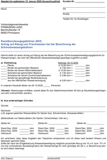 Bei der Berechnung der Schmutzwassergebühren können Wassermengen für Großvieheinheiten oder für Garten / Schwimmbad abgesetzt werden. Für diese Absetzungen ist ein schriftlicher Antrag erforderlich, der uns bis spätestens 15. Januar 2026 zu übersenden ist. Anträge die später eingehen, werden nicht berücksichtigt (Ausschlussfrist).