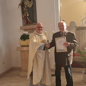 Stolz präsentiert sich Konrad Wagner mit der Urkunde von Bischof Dr. Karl-Heinz Wiesemann, die ihm im November 2024 Pfarrer Walter Augustin Stephan beim Patronatsfest in der Eppenbrunner St. Pirminiuskirche überreichen konnte.