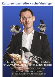 In diesem Jahr hätte Georg Kreisler seinen 102. Geburtstag gefeiert. Grund genug, die Lieder des Altmeisters von Kabarett-Chanson und schwarzem Humor auf die Bühne zu holen. Dies übernimmt für uns jemand, der es ausgesprochen gut kann. Konstantin Schmidt, Preisträger des Potsdamer Chanson Festivals 2012, hat Kreislers Lieder schon als 12-Jähriger gepfiffen. Hunderte Male hat er sie auf der Bühne präsentiert: Das Mädchen mit den drei blauen Augen, das Triangel, den Bluntschli, die Telefonbuchpolka, den Opernboogie und so weiter. Erstklassige Unterhaltung für Liebhaber des schwarzen Humors!