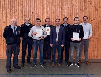 Foto: VG; v.l.n.r.:Vorsitzender des Kreisfeuerwehrverbandes Werner Oster, Wehrleiter Alexander Koch, Klaus Maschino, Wolfgang Rott, Klaus Weber, Wehrführer Daniel Hoffmann, Luca Glaser, Lukas Maschino