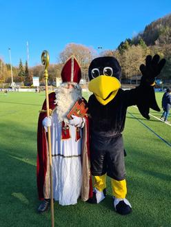 Nikolaus mit DFB-Maskottchen Paule im Weihnachtsdorf der DJK Püttlingen