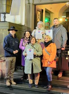 Bürgermeisterin Denise Klein ehrte die Spontanhelfenden des Hochwasserereignisses, hier Tanja Friedrich (Mitte), Heike Schweers (oben Mitte) und Patrick Fösges (oben rechts) im Beisein von Innenminister Reinhold Jost und Regionalverbandsdirektorin Dr. Carolin Lehberger.