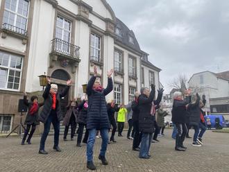 Die Tanzgruppe vor dem Püttlinger Rathaus.
