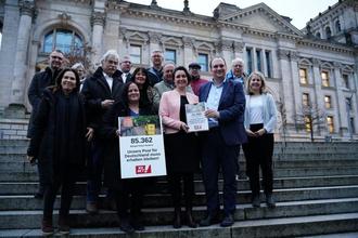 Das Stadtratsmitglied Tanja Friedrich (Mitte mit Petitions-Schild) zusammen mit Betriebsrätinnen und -räten der Deutschen Post, Kommunalpolitikerinnen und -politiker wie auch Bundestagsabgeordneten sowie Petitionsinitiator Rolf Büttner (oben rechts) in Berlin.
