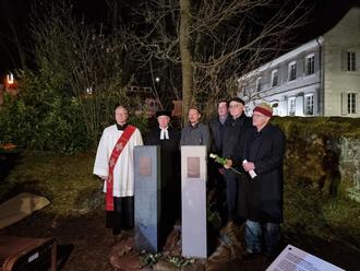 v.l.n.r.: Reimund Franz, Prof. Dr. Joachim Conrad, Beigeordneter Ulli Klein, Johannes Folz, Prof. Dr.-Ing. Franz Folz und Alban Dörr hinter dem Mahnmal.
