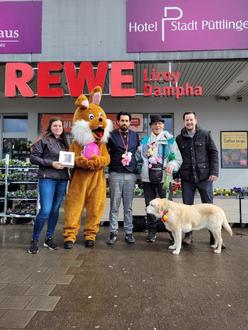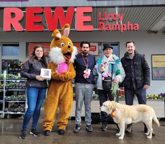 (v.l.n.r: Rebecca Goldbaum, Osterhase, Liroy Dampha, Theo Pelgen mit Labrador Kimi, Johannes Folz)