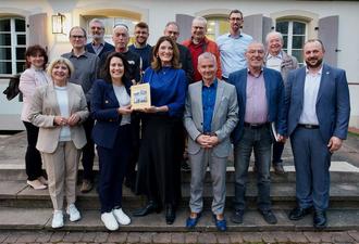 Das Autorenteam zusammnen mit Pascal Arweiler (MdL, 2.v.l. hinten) und (erste Reihe, v.l.n.r.) Bürgermeisterin Denise Klein, Dr. Carolin Lehberger (Vorsitzende des Vereins für Industriekultur und Geschichte sowie Regionalverbandsdirektorin), Monika Jungfleisch, Bürgermeister der Gemeinde Heusweiler Thomas Redelberger, Klaus Häusle (ehem. Bürgermeister der Gemeinde Riegelsberg) und Bürgermeister der Gemeinde Riegelsberg Benjamin Schmidt vor dem Püttlinger Schlösschen. Foto: Gross/Jungfleisch