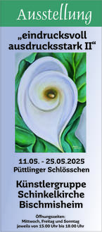 Vom 11. bis einschließlich 25. Mai 2025 zeigt die Künstlergruppe Schinkelkirche Bischmisheim im Püttlinger Schlösschen eine Ausstellung mit dem Titel „eindrucksvoll ausdrucksstark II“. Die Ausstellung ist jeweils mittwochs, freitags und sonntags von 15.00 bis 18.00 Uhr für Besucherinnen und Besucher geöffnet. Der Eintritt ist frei.