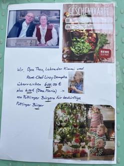 Angeregt durch die Weihnachtswunsch-Aktion der SIP (Soziale Initiative Püttlingen), wollte auch der Püttlinger Theo Pelgen etwas zur Unterstützung bedürftiger Püttlinger Bürger beitragen. Sein Plan: Für 600,- EUR wollte er insgesamt 15 REWE-Einkaufs-Gutscheine a 40,- EUR besorgen und an die SIP übergeben. Als REWE Geschäftsführer Liroy Dampha davon erfuhr, war es für ihn gleich klar, dass die Gutscheine aufgerundet werden. Unterstützt noch durch Oma Maria konnten alle Gutscheine auf einen Betrag von 50,- EUR erhöht und an Tanja Friedrich, Vorstandsmitglied der SIP, übergeben werden. Auch Bürgermeisterin Denise Klein freute sich sehr über diese Aktion und bedankte sich persönlich bei Theo Pelgen und Liroy Dampha bei der Übergabe der Gutscheine vor dem REWE Markt in Püttlingen.