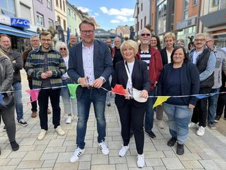 Staatssekretär Torsten Lang eröffnete die Fußgängerzone zusammen mit Bürgermeisterin Denise Klein im Beisein von Pascal Arweiler (MdL), Stadtratsmitgliedern, Verwaltungsmitarbeitenden, Anwohnenden und Gästen.
