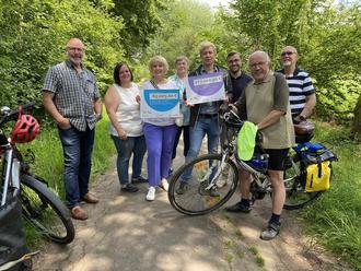 Bei der Übergabe der Zuwendungsbescheide auf dem (noch) maroden Köllertalradweg in Etzenhofen: Staatssekretär Sebastian Thul (Mitte) und Bürgermeisterin Denise Klein (Mitte) zusammen mit den Stadtratsmitgliedern (v.l.n.r.) Norbert Rupp, Tanja Friedrich, Pia Kammer, Pascal Arweiler (MdL), Friedhelm Münch und Gosbert Hubertus.