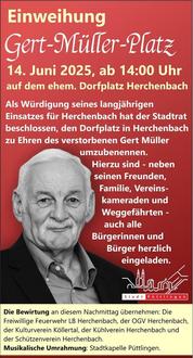 Der Dorfplatz im Püttlinger Ortsteil Herchenbach erhält einen neuen Namen: Gert-Müller-Platz. Mit einer feierlichen Einweihung am Samstag, 14. Juni 2025, würdigen der Püttlinger Stadtrat zusammen mit der Stadt Püttlingen das langjährige ehrenamtliche Engagement von Gert Müller (1947–2022) – einem Menschen, der das Leben in Herchenbach über Jahrzehnte hinweg geprägt hat.