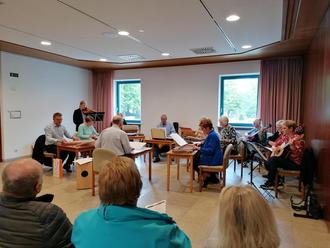 Eigentlich war diese Reise bereits für 2020 geplant, doch Corona hat die Fahrt zum 125-jährigen Jubiläum ausgebremst. Daher freuten sich jetzt an Christi Himmelfahrt 30 Personen - Aktive und Inaktive - umso mehr auf die Reise nach Marktoberdorf im Allgäu. Sie war als Konzertreise geplant, weshalb sich die Aktiven gleich nach der Ankunft im Hotel Greinwald zur Probe trafen. Denn bereits am Freitag war im Rathaus ein Konzert angesagt. Der Vormittag wurde mit einer Fahrt zum Tegelberg genutzt und die Tegelbergbahn brachte die Gruppe auf eine Höhe von 1700m. Zur großen Überraschung hatte es dort erst in den letzten Tagen geschneit. Dennoch konnten alle auf der Terrasse Kaffee und Kuchen genießen. Zurück im Hotel ging es für die Aktiven gleich ins Rathaus zum Aufbau, Stimmen und Einspielen der Instrumente. Im anschließenden Konzert konnten die Spieler und die beiden Sängerinnen die Zuhörer mit ihrem neuen Programm erfreuen, ob es „La Rose“ von Amanda McBroom, „Only You“ von den Flying Pickets oder „Plaisir d‘ Amour“ von Jean-Paul-Égide Martini waren. Ansonsten hatte der Vorsitzende Hans Dieter Speicher bewusst auf bayrische Stücke gesetzt. Die Zuhörer geizten daher auch nicht mit Applaus und die Musiker nicht mit einigen Zugaben.