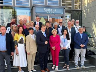 Die Delegationen aus dem Städtebündnis vor dem Senftenberger Rathaus. In der Bildmitte Senftenbergs neu gewählter Bürgermeister Andreas Pfeiffer neben Bürgermeisterin Denise Klein.