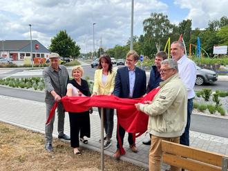 „Kunst im Kreisel“ – Bunte Segel in den Farben der Partnerstädte stehen symbolisch für die Seestadt Senftenberg und bilden den Bezug zum „Europäischen Städtebündnis“. Delegationsvertreter*innen, unter Ihnen auch Senftenbergs Bürgermeister a. D. Andreas Fredrich bei der offiziellen Übergabe des neuen Verkehrskreisels in der Innenstadt.