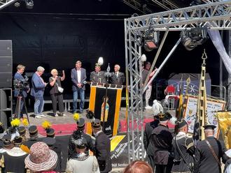 Mit einem herzlichen „Glück Auf“ begrüßte Bürgermeisterin Denise Klein bei der Abschlussveranstaltung am Senftenberger See die über 300 Teilnehmer*innen an der Landesbergparade, unter ihnen auch eine Delegation aus Püttlingen.