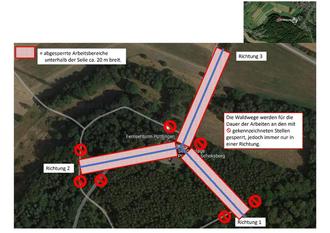 Aufgrund von Montagearbeiten an den Abspannseilen am Funkmast Schoksberg durch die Deutsche Funkturm GmbH werden ab Montag, dem 26.06.2023 die Waldwege in diesem Bereich für die Dauer der Arbeiten gesperrt. Die Arbeiten werden in drei Abschnitte unterteilt, wobei für jeden Abschnitt ein jeweiliger Absperrbereich eingerichtet wird. Begonnen wird mit der Seilrichtung 1, dann Richtung 3 und als letzte die Richtung 2.