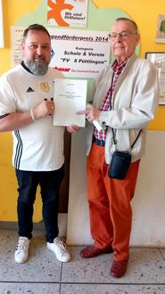 Gerhard Schreiner, Geschäftsführer des Fußballverein 08 Püttlingen hat mit Herrn Petermann, Schulleiter der Pater-Eberschweiler-Grundschule den Kooperationsvertrag für das neue Schuljahr unterschrieben.