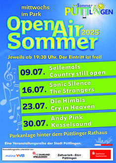 Auch in diesem Jahr lädt die Stadt Püttlingen wieder zu ihrer beliebten Veranstaltungsreihe Open-Air Sommer: mittwochs im Park ein. An insgesamt vier Mittwochabenden verwandelt sich die Bühne hinter dem Rathaus in eine stimmungsvolle Open-Air-Arena und bietet ein abwechslungsreiches Musikprogramm für Jung und Alt. Bei freiem Eintritt dürfen sich die Besucherinnen und Besucher auf stimmungsvolle Sommerabende in besonderem Ambiente freuen.