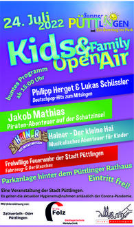 Los geht das Kids&Family Open Air am Sonntag, 24. Juli 2022, um 15.00 Uhr in der Parkanlage hinterm Rathaus. Hier erwarten große und kleine Besucher folgende Akteure: