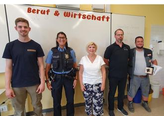 Am 12. Juli 2023 hatte die Peter Wust Schule hohen Besuch im Wahlfachkurs Beruf und Wirtschaft: Denise Klein, Püttlinger Bürgermeisterin, Haiko Sehn, Prozessmanager bei Apolog GmbH, Thomas Müller von der Firma Fliesen Müller, Frau Annam von der Polizeidienststelle Völklingen und Azubi Matthias Thewes aus der Schreinerei Dincher. Das Team stellte den Schüler*innen den eigenen Werdegang vor und sprach über den derzeit ausgeübten Beruf.