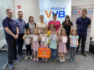 Wie lege ich einen Verband richtig an? Welche Informationen sind beim Notruf unter der 112 wichtig? Wie handel ich im Notfall richtig? Diesen Fragen gingen die Kinder im Kurs nach, die Yannic Dietz und Martin Chouteau ihnen anschaulich beantworteten. Von der stabilen Seitenlage über die Erstversorgung einer Verletzung bis hin zum Absetzen eines Notrufes über ein Übungsnotruftelefon konnten die Kinder den Ernstfall proben. Am Ende des Kurses erhielten die Kinder eine Urkunde und ein kleines Geschenk. Gesponsert wurden die Kurse komplett von der Vereinigten Volksbank – meine vvb, dem Sparverein Saarland e.V. und SAARLUS – Training und Service und war somit für die jungen Teilnehmerinnen und Teilnehmer kostenlos.