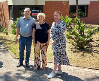 (v.l.n.r.) Markus Thiel, Vorsitzender des Selbsthilfeverein Kindertagesstätte Püttlingen e. V., Bürgermeisterin Denise Klein und Ministerin für Bildung und Kultur Christine Streichert-Clivot bei der Übergabe des Förderbescheids vor den Räumlichkeiten in der Kirchstraße.