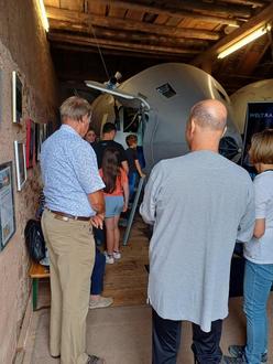 Im Weltraum-Atelier konnten die insgesamt 40 Wissensdurstigen alles über das Weltall erfahren, ohne dass dafür Vorkenntnisse nötig waren. Christoph Pütz und seine Kollegin hielten dabei zwei unterschiedliche Führungen für die Teilnehmenden parat. So erfuhren die Kinder und ihre Begleitpersonen viel über das Leben eines Astronauten, zum Beispiel wie man sich in der Schwerelosigkeit die Zähne putzt oder wie das Internet im Weltraum funktioniert. Auch ein Raumschiff kann im Atelier besichtigt werden. Die Nachbildung des Apollo-13-Raumschiffs wurde zum Filmstart des gleichnamigen Hollywood-Blockbusters mit Tom Hanks Anfang der 90er-Jahre gebaut und diente als Werbung für den Kinofilm. Heute können Besucherinnen und Besucher des Ateliers in die Kapsel einsteigen, die nachgebaute Konsole bedienen und sich wie Astronauten fühlen. Den Kindern wurde auch unser Sonnensystem anschaulich erklärt und im Hof zusammen mit ihnen nachgebildet. Zum Abschluss wurden sogar eigene Raketen gebastelt und mithilfe einer Luftdruckrampe über die Dächer der Häuser geschossen. Nach der Kinder-Führung waren die Erwachsenen an der Reihe. Auch sie konnten bei einem spannenden Vortrag den Erzählungen des Hobbyastronomen lauschen. Dabei wurden Videoaufnahmen des Gründers des Weltraum-Ateliers, Sebastian Voltmer, von den Polarlichtern gezeigt und auch, wie diese von der ISS aus für die Astronauten im Weltall aussehen. Aufnahmen vom Mars, auf denen der Olympus Mons zu sehen war sowie viele weitere Bilder von Saturn, Jupiter und dem Mond zeigten anschaulich, welche Formationen bisher auf den Planeten und Satelliten unseres Sonnensystems entdeckt wurden. Spektakulär waren ebenfalls die Videos zum Start der Saturn V, die Rakete, die bei der Apollo 11 Mission Astronauten zum Mond brachte. Mit dieser hatte John F. Kennedy sein Versprechen, die Menschheit bis Ende der 60er-Jahre auf den Mond zu bringen, gehalten.