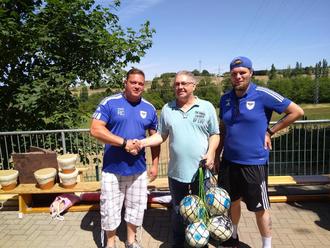 Markus Thiel nimmt die Bälle stellvertretend für alle KiTa-Kinder von Herrn Reisdorf und Herrn Köllen entgegen.