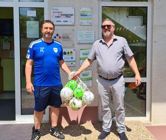 Im Bild nimmt Herr Thiel die Bälle stellvertretend für alle KiTa-Kinder von Herrn Langner entgegen.